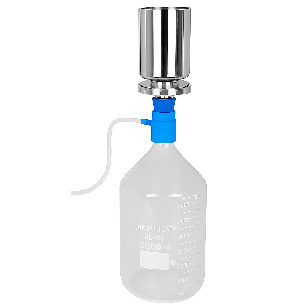 A Bottle Top Solvent Filtration Unit (also called a “bottle-top filter” or “bottle-top vacuum filter”) is a device that screws directly onto the neck of a solvent or reagent bottle (typically with a standard GL-45 or similar thread) and allows the solution in the bottle to be filtered (often under vacuum) through a membrane inside the top unit. This enables filtration of the solvent/mobile phase directly from the bottle into downstream use or another reservoir, reducing transfer steps, contamination risk, and exposure to air or particles.