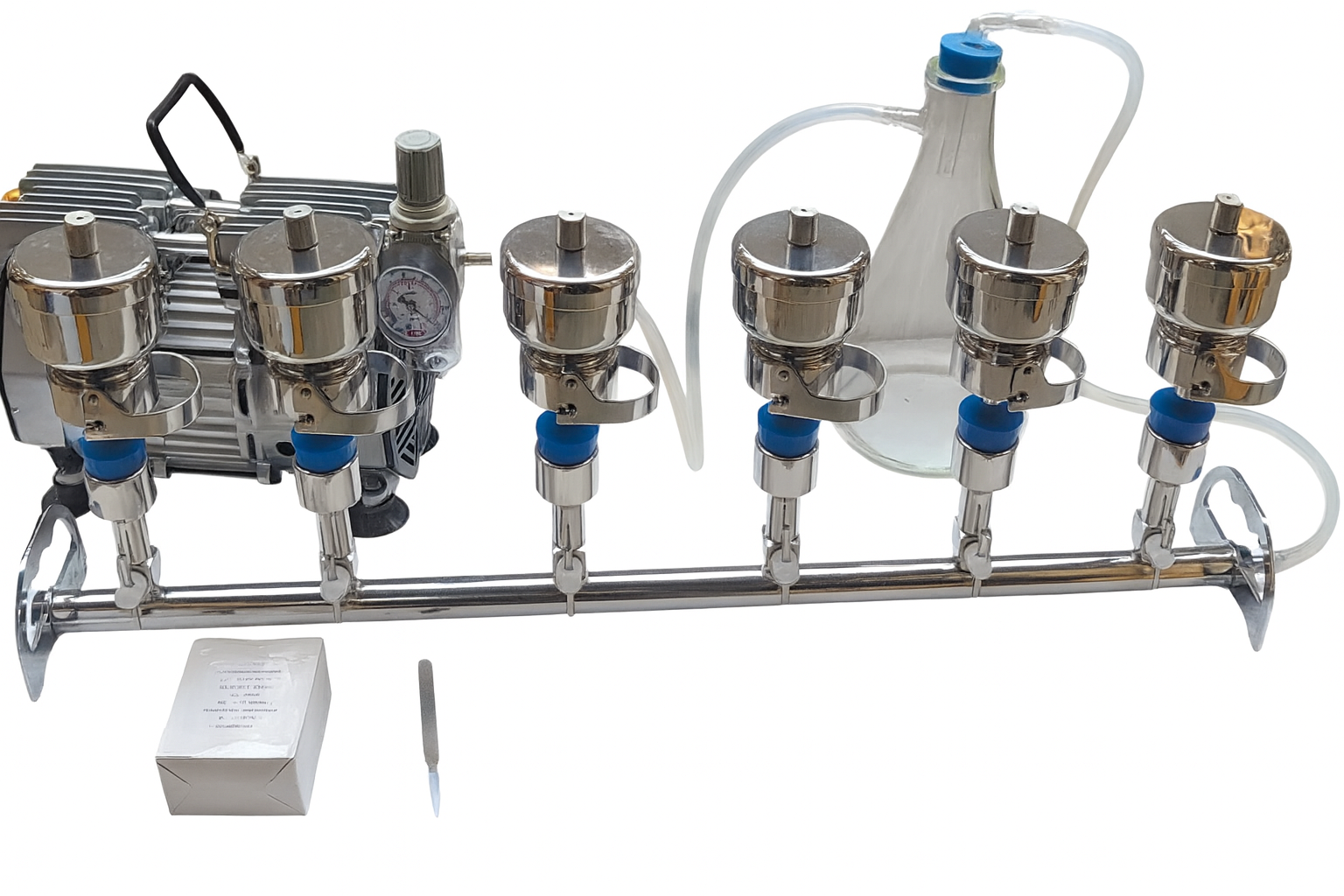 The vacuum filtration manifold with kit consists of lid (SS316), funnel (SS316), sieve plate (SS316), clamp (aluminum alloy), filter head and holder (SS316). It is widely used to filter several samples simultaneously. The vacuum filtration manifold features a mechanical lock without complex mechanical structure. Each filter hold has an individual control vale and can be combined with vacuum pump for filtering solvents, suspended particles, bacteria etc. in cleanroom environment